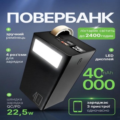 Повербанк 40000 mah 22.5W Qinetiq Phoenix RQ-40 з LED дисплеєм і швидкою зарядкою PD/QC 3 порта кабе