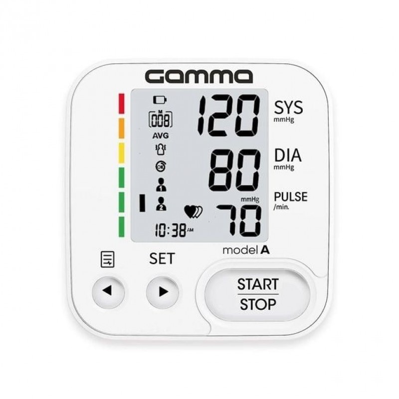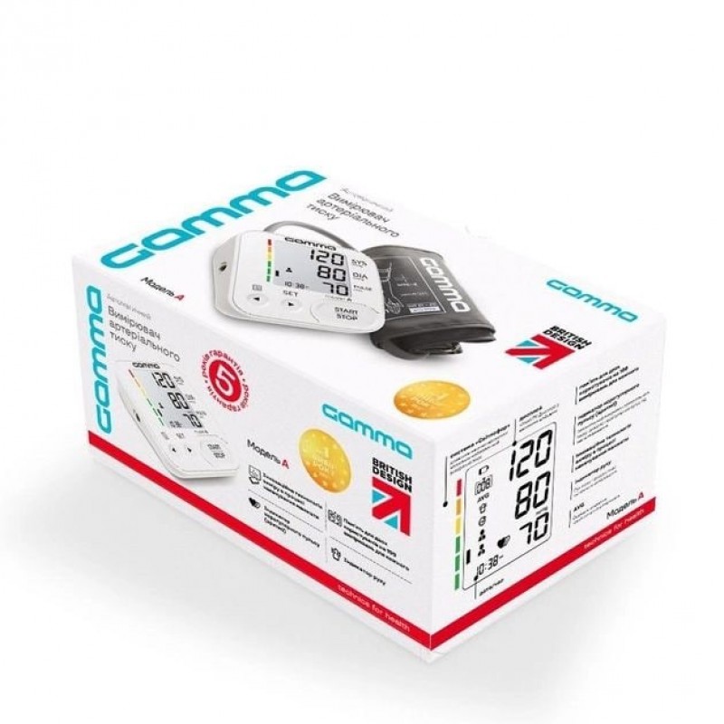 Опис: Всесвітньо відома ТМ Gamma під час відкриттів, технологій та вдосконалення здійснила новий суттєвий виток у галузі контролю за здоров'ям та його підтримки в домашніх умовах і представляє нове покоління тонометрів 4 Generation. професійне обслуговування техніки Gamma в гарантійний та післягарантійний періоди. поколения. Скорочений час вимірювання завдяки новітньому алгоритму аналізу даних. Нова електроніка і датчики. (+16%).Компресор Gamma виконує 35000 повних циклів роботи (компресори тонометрів зазвичай виконують 30000 циклів). вимірі автоматично визначається ступінь накачування манжети, запобігаючи її перекачування, що дозволяє зробити вимір максимально комфортно і швидко; Лікарі рекомендують аналізувати середнє значення трьох послідовних вимірювань, зроблених з інтервалами в 2-3 хвилини. великими символами дозволяє використовувати прилад людям з поганим зором. Екран розташований вертикально, з нахилом, що дозволяє використовувати прилад, при необхідності, в стані лежачи; вкаже про відхилення від норми живлення від батарей; звуковий сигнал супроводжує процес вимірювання.• Осцилометричний спосіб вимірювання тиску • Збільшений рідкокристалічний дисплей – 52 х 58 мм • Діапазон вимірювань артеріального тиску від 30 до 280 мм рт. ст. • Максимальне значення рівня тиску – 280 мм рт. ст. • Точність вимірювання тиску – ±3 мм рт. ст. або ±2% значення результату • Одиниця виміру – мм рт. ст. • Діапазон частоти пульсу від 40 до 199 ударів на хвилину • Точність вимірювання частоти пульсу - ±5% значення результату • Пам'ять на 90 вимірювань для кожного з двох користувачів • Розмір манжети - від 22 до 32 см • Діапазон робочих температур від 5°C до 40°C, при відносній температурі -20°С до +55°С, при відносній вологості 15-95% • Джерело живлення - 4 батарейки типу ААA на 1,5В • Розміри приладу без манжети - 102 х 107 х 40 мм ААA, гарантійний талон. Виробник: Gamma (Китай) Країна реєстрації бренду: Великобританія Гарантія: 5 років