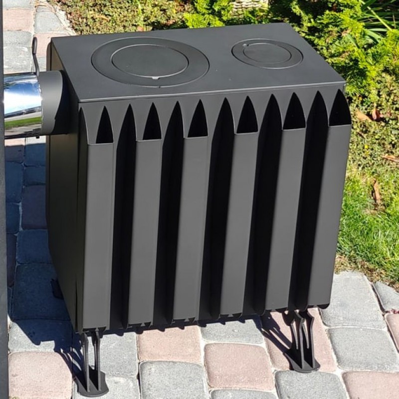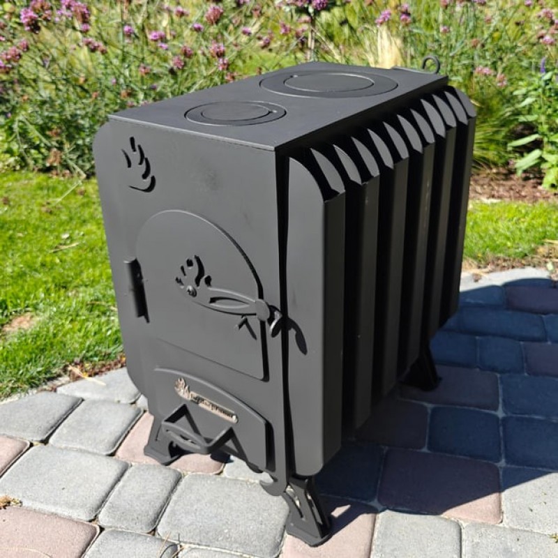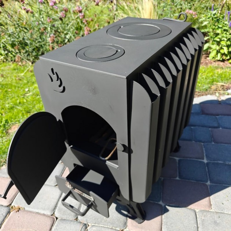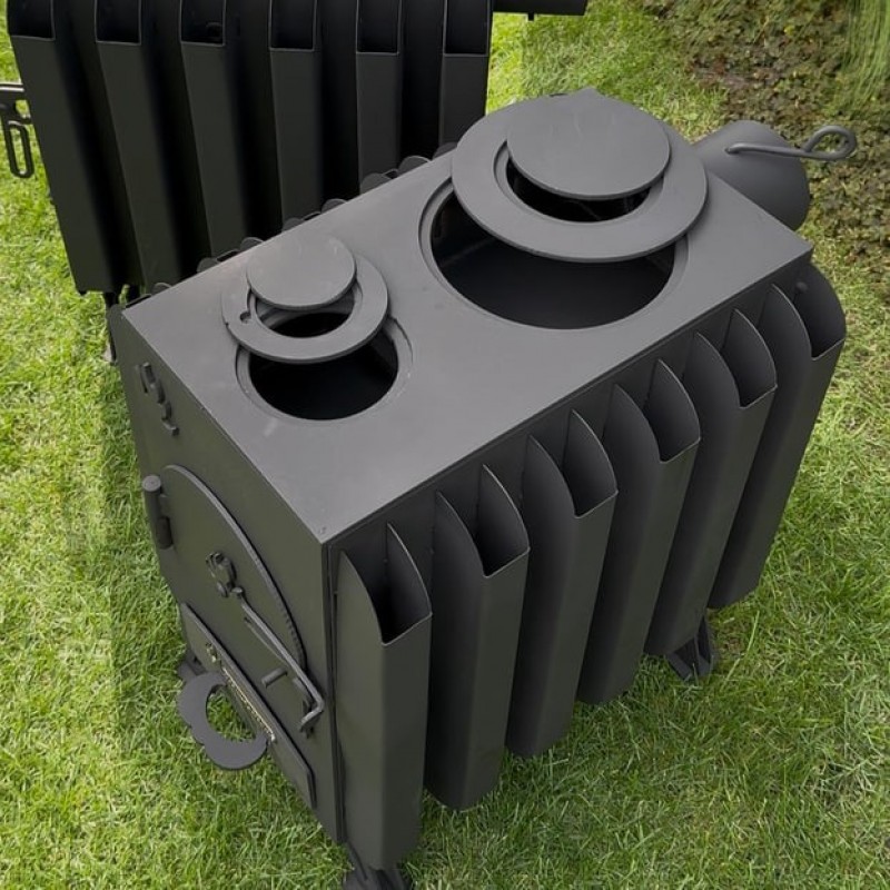 Ця дров'яна буржуйка для будинку виготовлена з міцної сталі товщиною 4 мм, що гарантує довговічність і стійкість до високих температур. Модель «Батарея» має варильну плиту з двома конфорками, на якій можна приготувати їжу або закип'ятити воду. Вона забезпечить тепло, затишок і можливість готувати їжу навіть у віддалених місцях. Чавунні колосники в топковій камері, зручний зольник на всю глибину печі і шибер для регулювання тяги роблять використання буржуйки максимально комфортним.